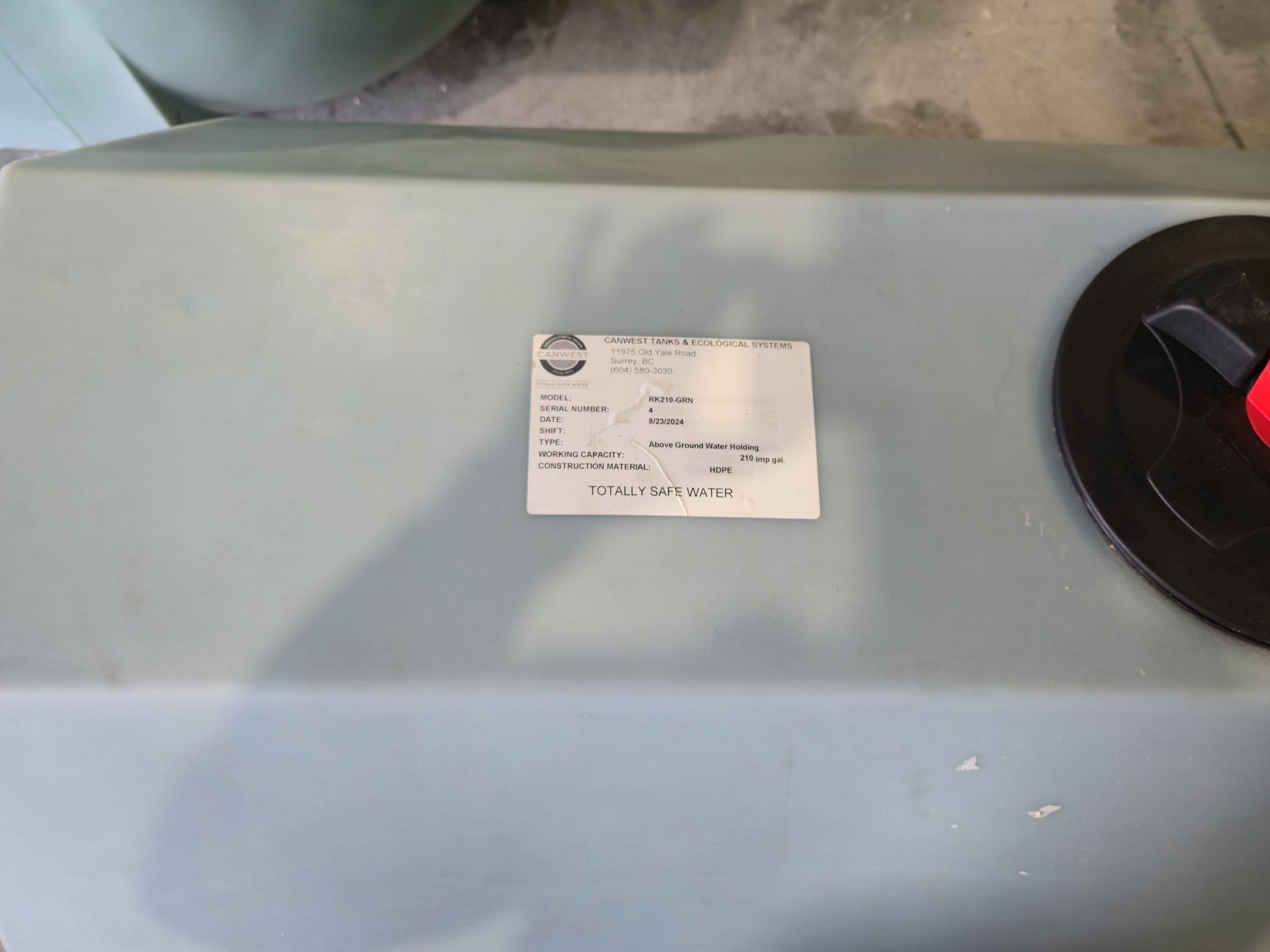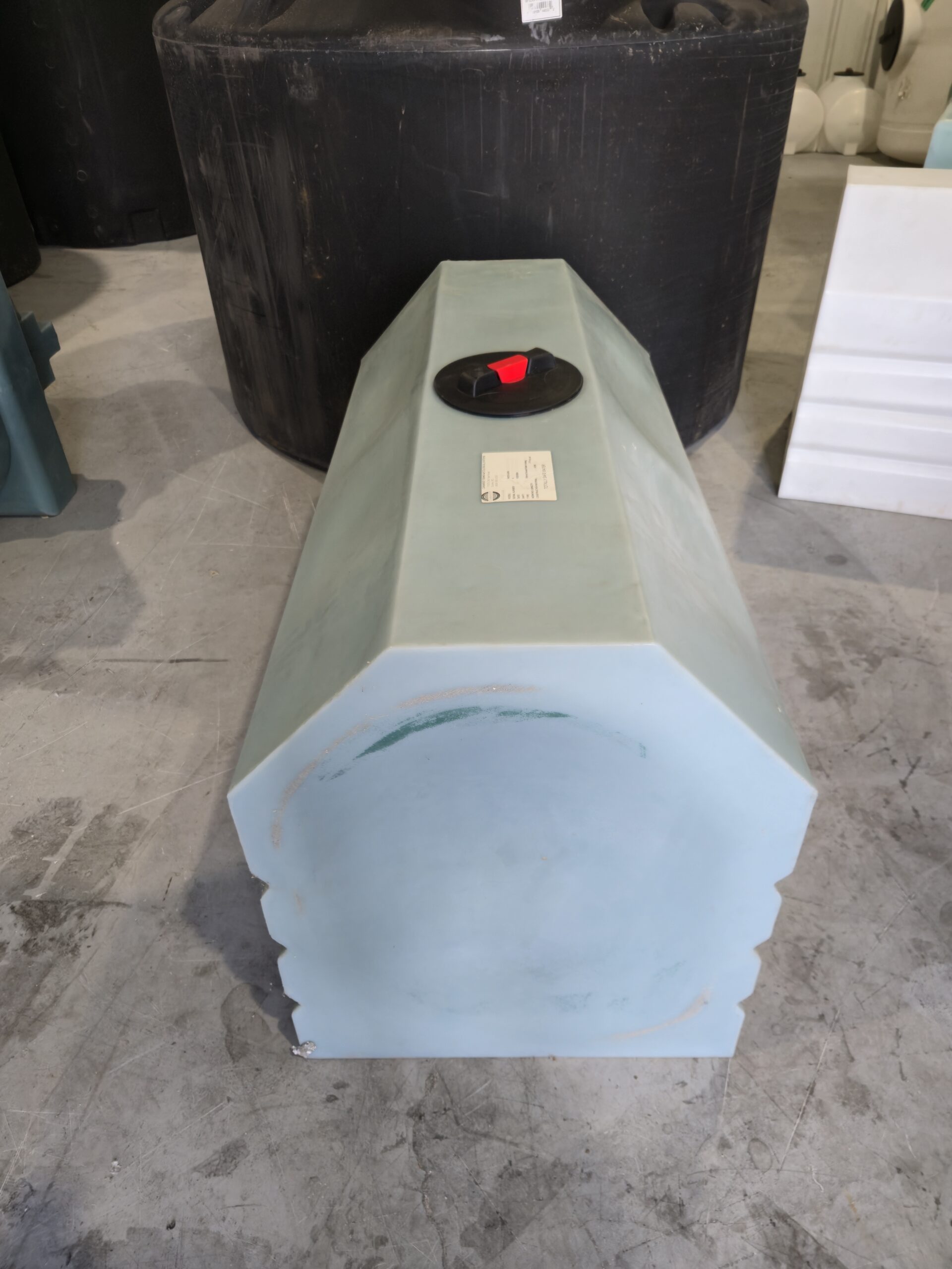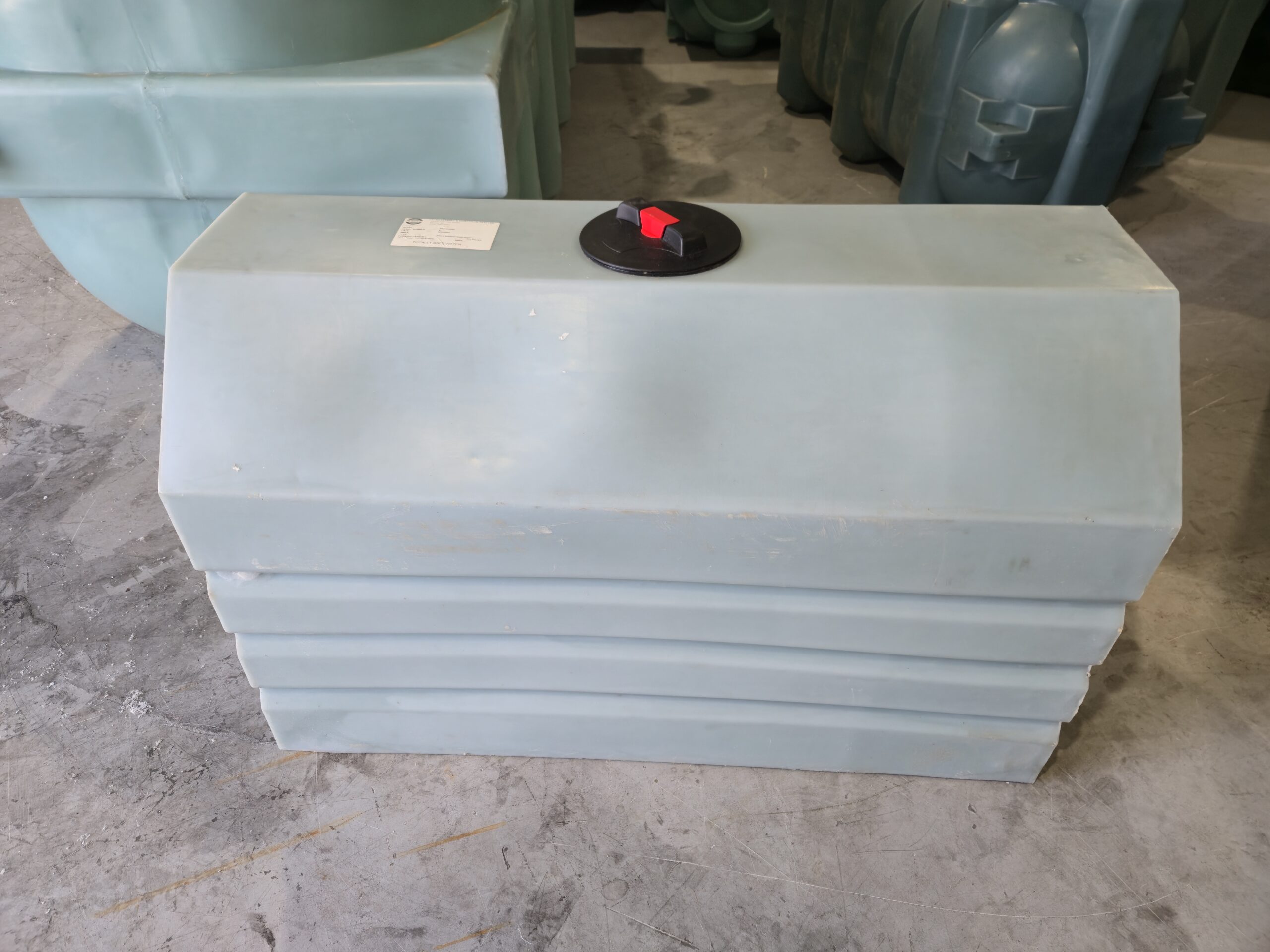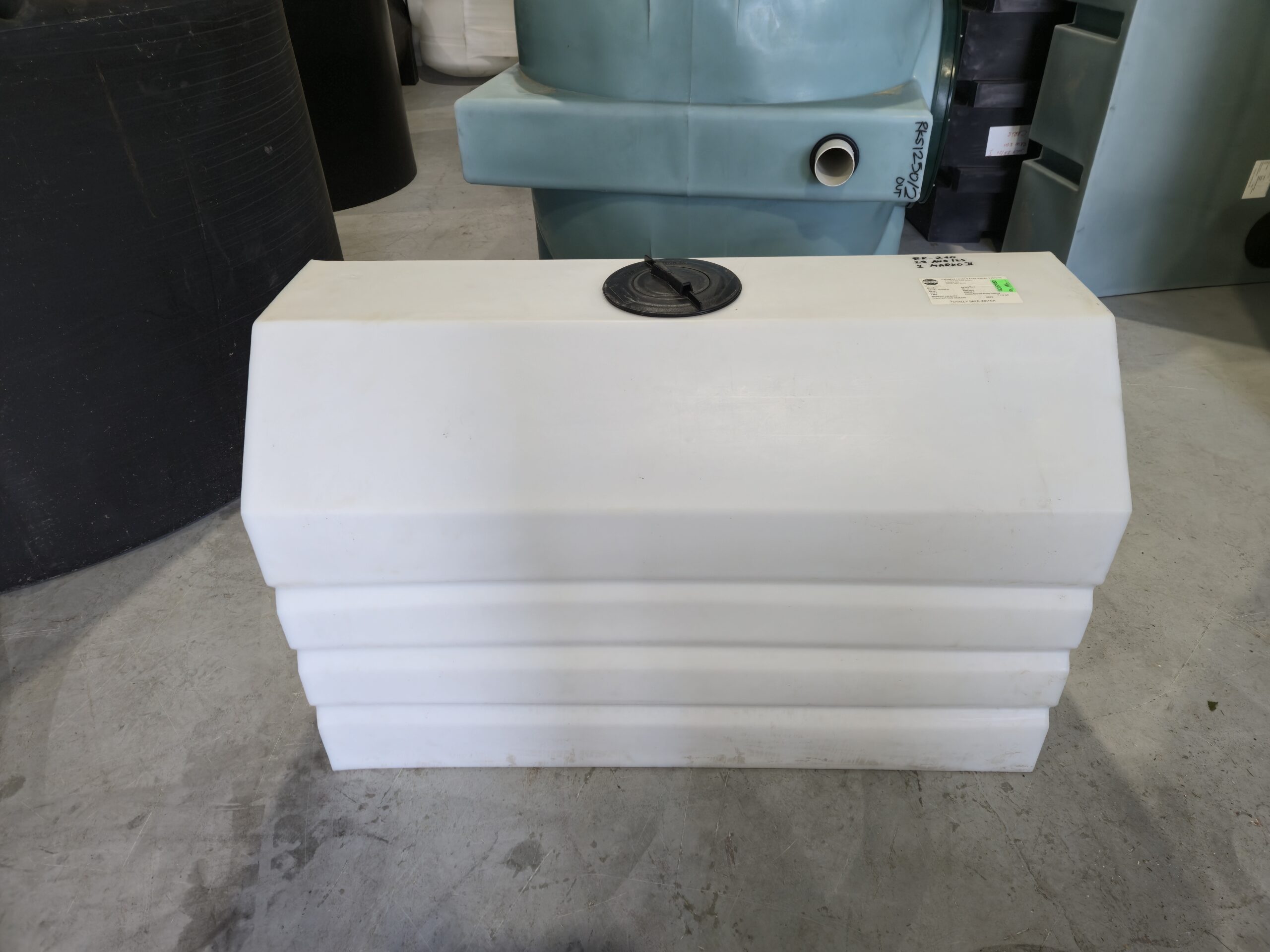 210 imperial gallon rectangular tank manufactured by Canwest Tanks. Can be used for transportation or stationary above ground storage. Suitable for potable water or other fluids with specific gravity of 1.5 or less. Made from HDPE.