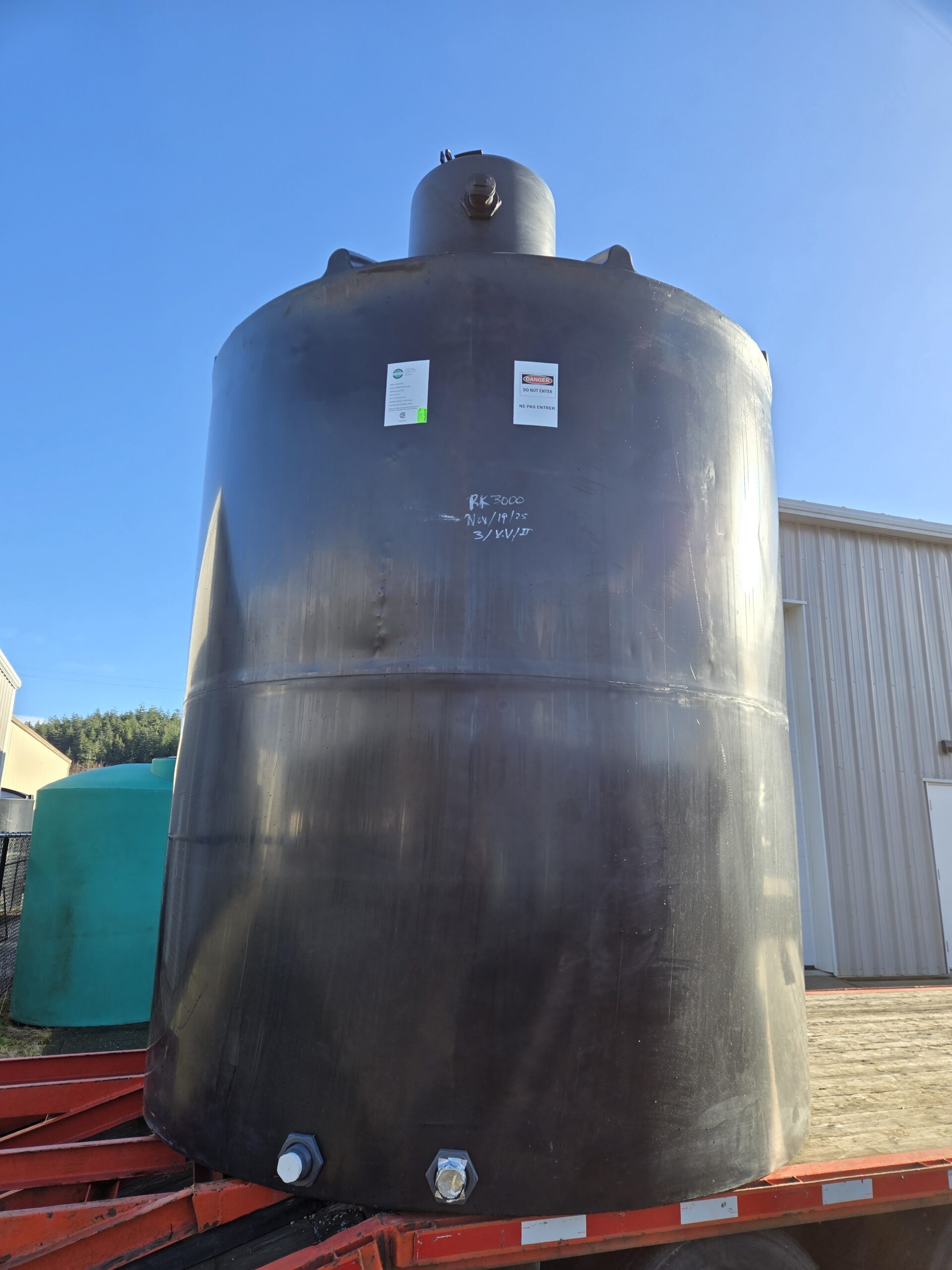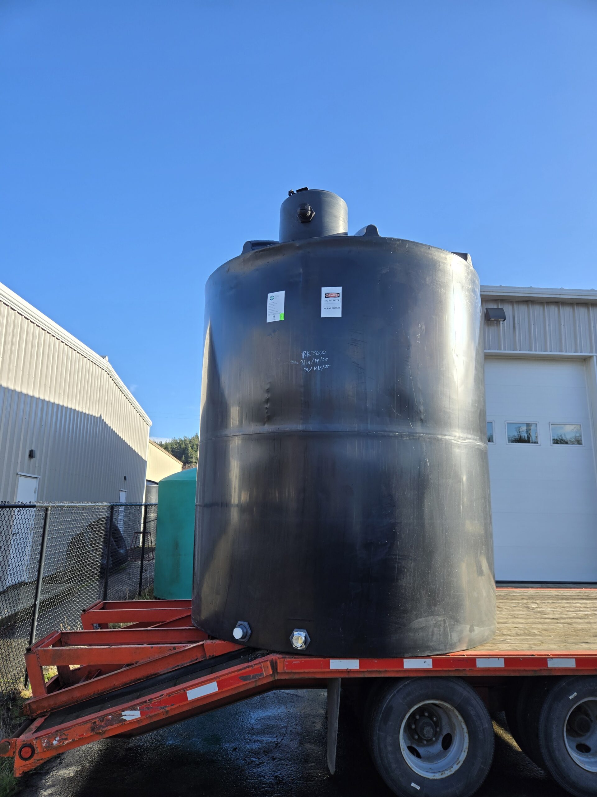 3000 imperial gallon above ground water storage tank manufactured by Canwest Tanks. CSA approved for potable water storage. Comes with 2x 2" fittings at the bottom for drainage and 2x 2" fittings at the top for overflow. Suitable for water or other fluids with specific gravity of 1.1 or less. Made from HDPE.